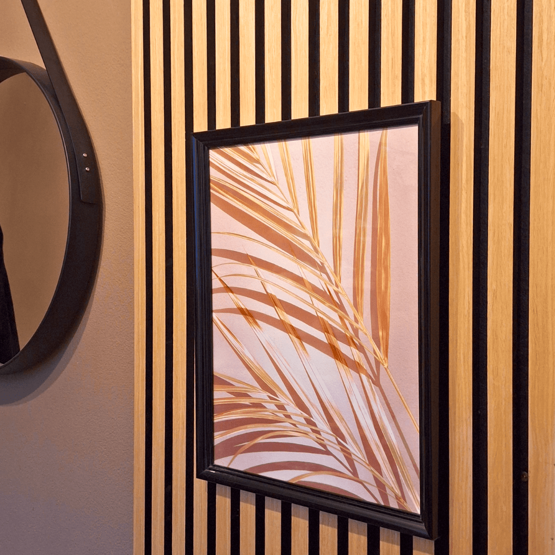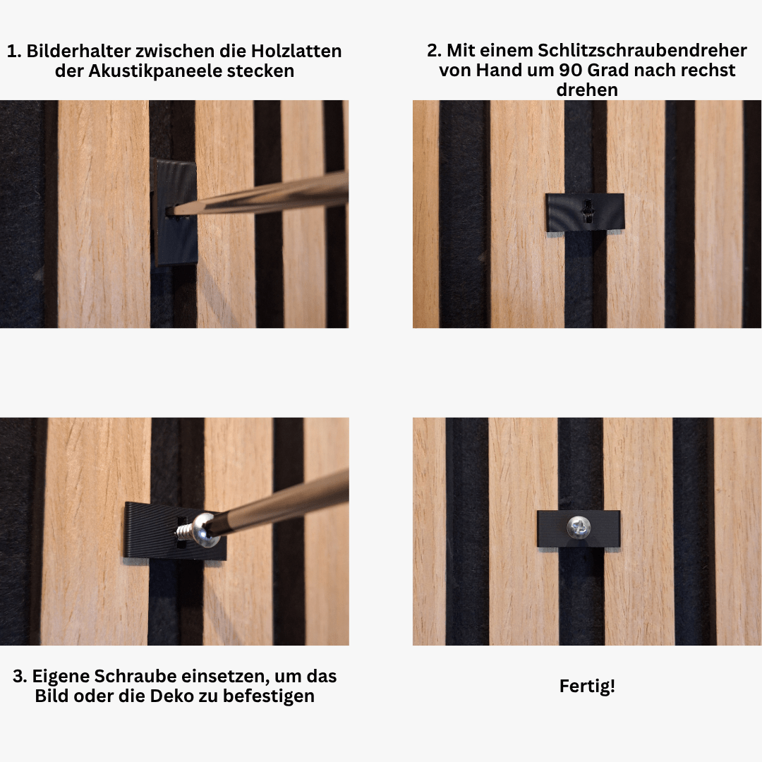» Bilderhalter zwischen die Holzlatten der Akustikpaneele stecken.